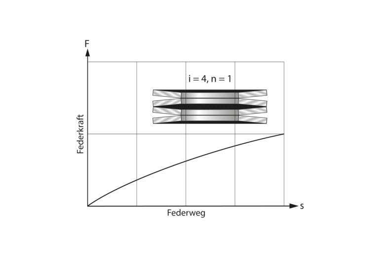 Im Unterschied zu Schraubenfedern lassen sich Tellerfedern schichten, um unterschiedliche Federkennlinien zu erhalten (lineare, degressive oder progressive Kennlinien ):