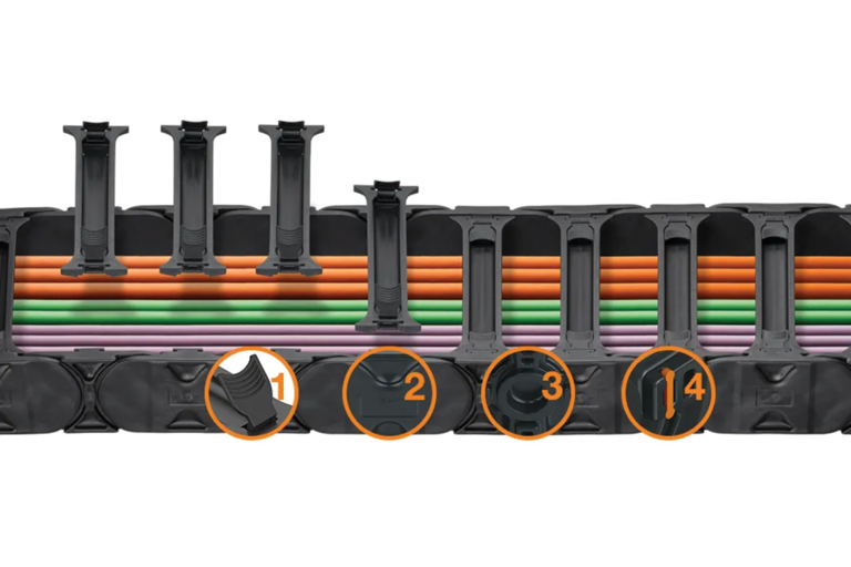 - Вертикални и хоризонтални ограничители – вертикалните ограничители осигуряват допълнителна твърдост и позволяват големи неподдържани дължини. Хоризонтално разположените ограничители са особено важни, ако кабеловодещата верига се нуждае от определена степен на гъвкавост и издръжливост в зони с прекомерно огъване, например при дълги ходове.