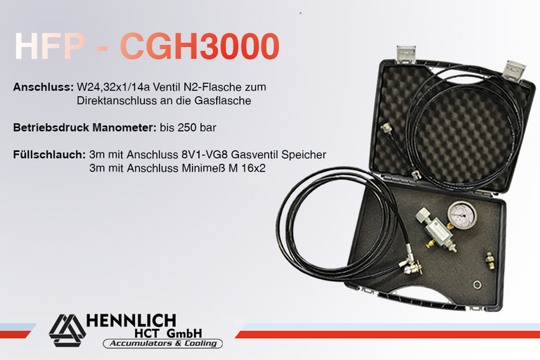 Das Füll und Prüfvorrichtungs-Set CGH3000 dient zum Füllen, Prüfen und Einstellen des Vorfülldrucks von Hydraulikspeichern. Anders als bei dem Standard Multigerät HFP, wird diese Einheit an die Gasflasche geschraubt und der Schlauch an dem Speicherventil angeschlossen. In kompakten Einbausituationen, mit Gasventil 8V1 (meist üblich bei den Kolbenspeichern) oder alternativ Minimeß M16x2, kann dies von Vorteil sein.
