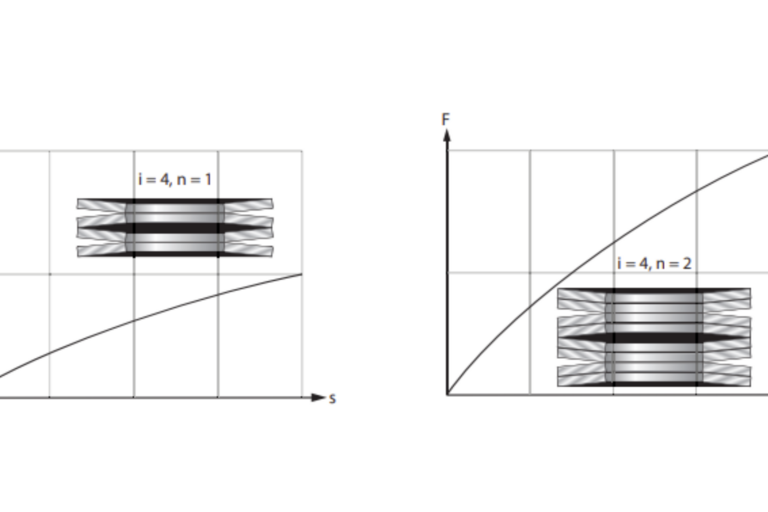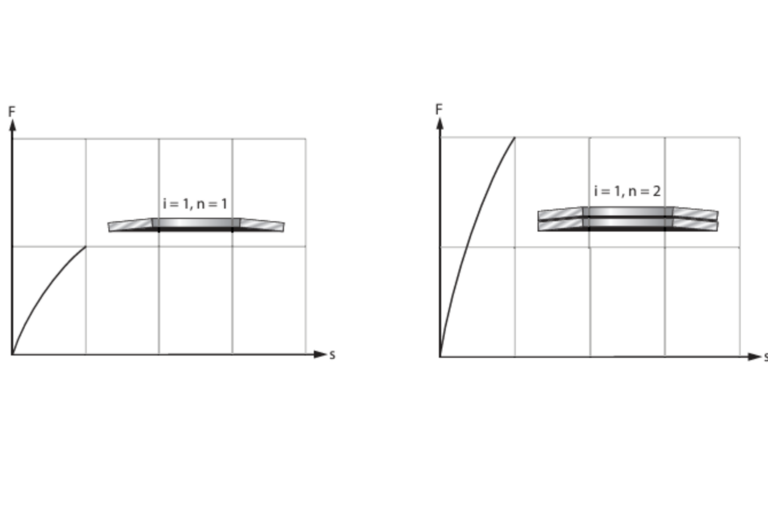 In imaginea din stanga se poate observa Forta-cursa unui singur arc disc/ Forta-cursa unui pachet de arc disc format din 2 bucati de arc disc