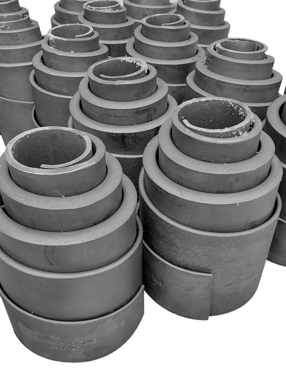 Arcurile volute sunt produse la cald din otel plat, un material durabil si rezistent. Procesul de fabricatie implica rularea otelului plat pentru a obtine forma spiralata sau elicoidala a arcului. Capetele superioare si inferioare ale arcului sunt subtiate pe valt, iar capetii sunt taiati oblic pentru a permite o asezare corecta a arcului.