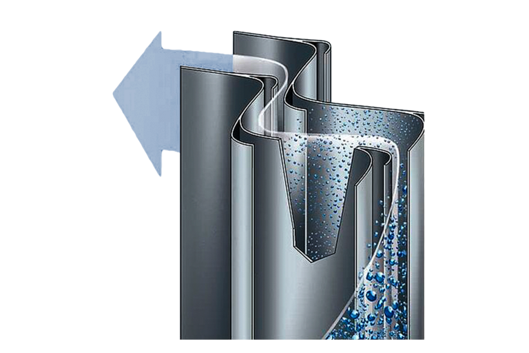 Forma profilului lamelelor de separare determina cat de repede si complet pelicula lichida formata in separarea primara este drenata de peretele profilului. In acest scop, pe lamelele de separare sunt amplasate camere de separare a fazelor cu forma speciala. Forma si dimensiunea acestora, impreuna cu numarul de deviatii, influenteaza pierderea de presiune a sistemului de separare.