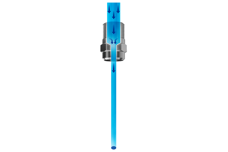 Duzele cu jet compact de presiune inalta de la Lechler unt caracterizate printr-un fascicul stabil si energic, care nu se intrerupe nici la presiuni mari de lucru. Pentru folosirea cu preisune inalta exista duze intarite din oxel inoxidabil, la alegere cu insertie de metal dur.