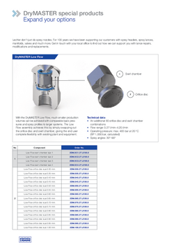 Seria Lechler DryMASTER este o solutie inovatoare pentru atomizarea de precizie in procesele de uscare prin pulverizare. Cu un design modular, DryMASTER ofera flexibilitate intr-o varietate de aplicatii si simplifica intretinerea fara a compromite calitatea atomizarii. Acestea sunt duze de precizie care au fost dezvoltate special pentru uscare prin pulverizare. Seria DryMASTER a fost proiectata in mod deliberat pentru a fi modulara, pentru a acoperi in mod fiabil o gama larga de aplicatii.