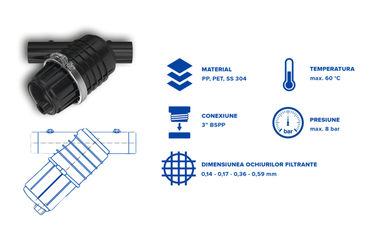 Carcasa filtranta conceputa pentru debite mari si pierderi de presiune reduse. Pentru presiuni de lucru de pana la 8 bar. Carcasa este echipata cu un element de redirectionare a debitului, evitand astfel obstructia insertiei filtrante in fata iesirii si permitand particulelor de murdarie sa se depuna pe fundul carcasei filtrante. Carcasa este pregatita pentru conectarea a 2 manometre, permitand urmarirea si controlul presiunii. Carcasa filtranta poate fi echipata cu multiple variante de site de filtrare, in functie de capacitatea de filtrare aleasa.